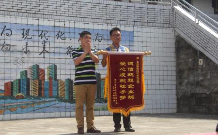 最后,重庆易和集团实业有限公司总经理黄总、重庆勃翰物流公司总经理陈坤,给学生发放了背包、T恤衫、帽子。